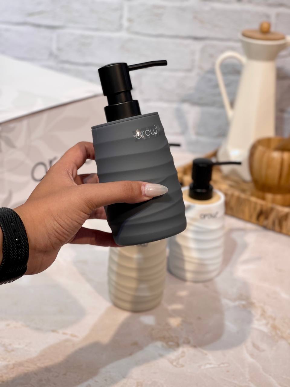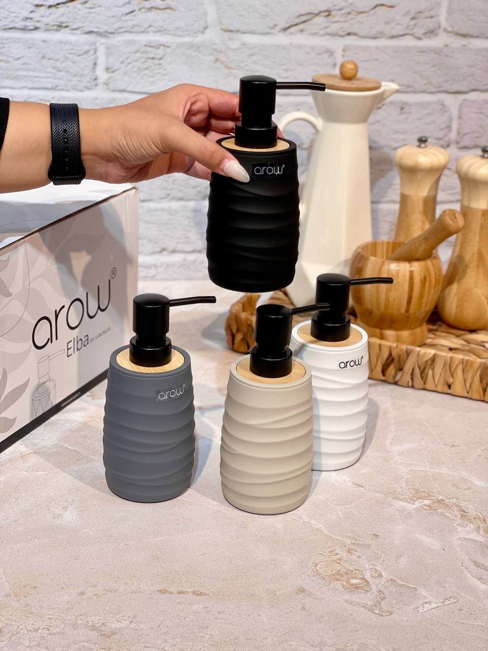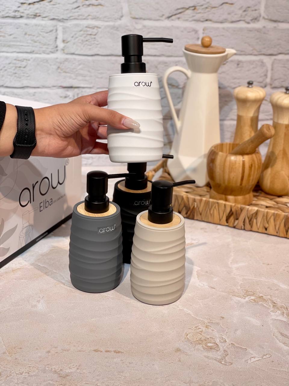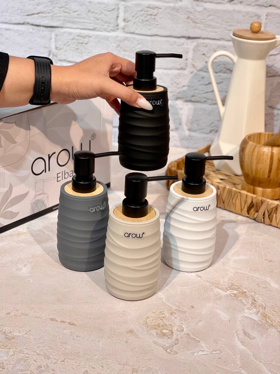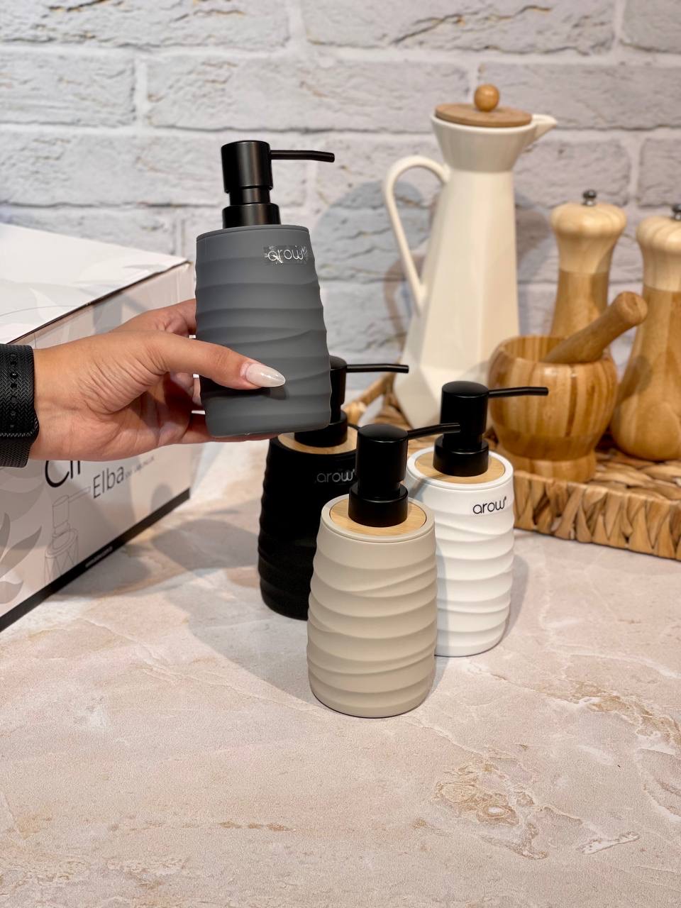 جا مایع پمپی Gallo محصول arow ترکیه🇹🇷🇹🇷🇹🇷 جنس:اکرولیک با رویه بامبو کاملا ضد آب✅️ مقاوم در برابر ضربه در چهار رنگ مشکی،طوسی،سفید و کرم